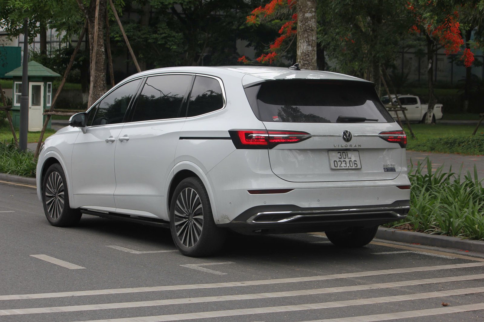 Phía sau gây ấn tượng với cụm đèn hậu LED được kết nối bởi thanh crôm, trong đó có đặt logo thương hiệu Volkswagen và tên mẫu xe dưới logo. Mặc dù thuộc phân khúc MPV, Viloran vẫn không thiếu sự thể thao với ống xả kép và cánh lướt gió phía trên.